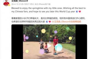 艾克森在社媒双语发文:Blessed to enjoy the springtime with my little ones. Wishing all the best to my Chinese fans, and hope to see you later this World Cup year ⚽️❤️